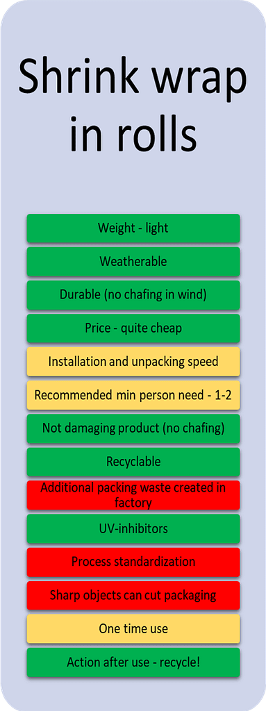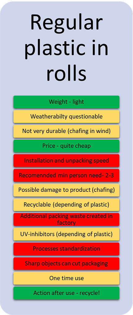 Different approaches have their own plusses and minuses. More traditional ways of packing have been either packing with regular plastic (material in rolls), packing with PVC covers (or similar types), packing with shrink wrap plastic (material in rolls) or hybrid solutions from all of those above.