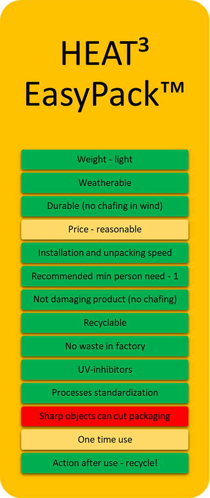 The constructor has the option to pack the module/s themselves or hire a professional for this task, but HEAT³ encourages users to do it themselves with the full support of HEAT³ (training, free guidelines, and free advice), keeping more money “in the house”. Using HEAT³ EasyPack™, modules manufacturers will have a more efficient standardized process, minimum personnel involved with packaging and, not to forget, happier packers and merrier module installers at the construction site.